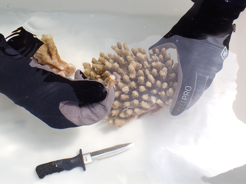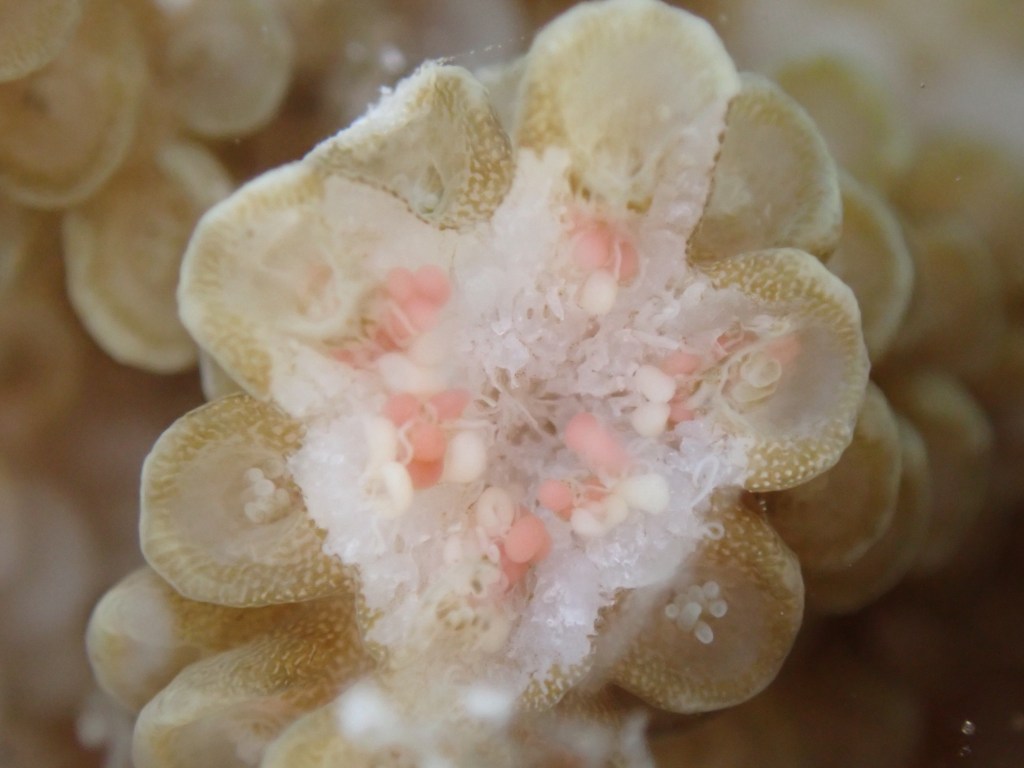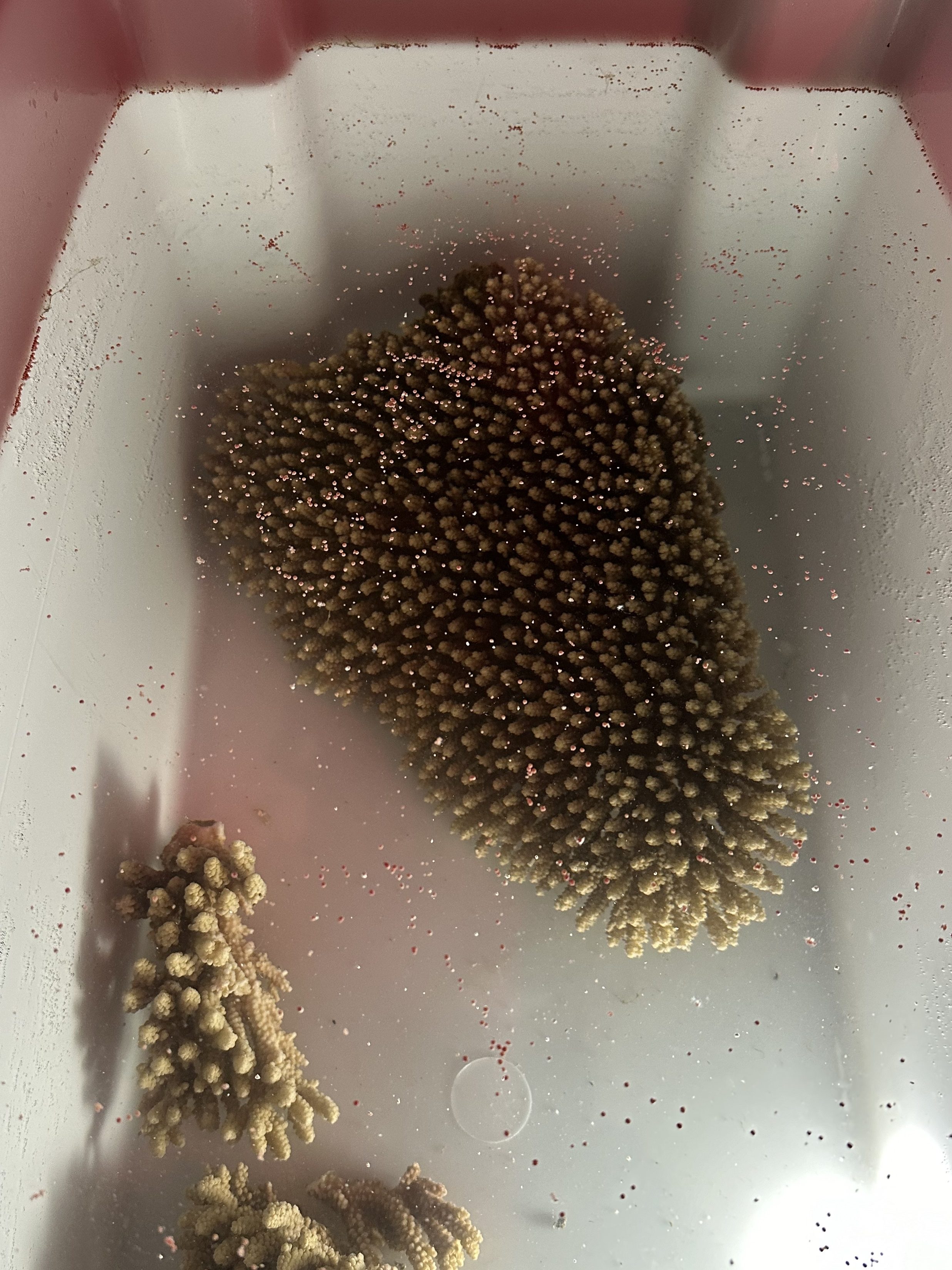 Our collected corals spawned on the 6th, 7th and 8th nights after the full moon on 27 November. On spawning nights, we isolated our corals into individual tubs just before sunset, then left them quietly alone in the dark to start spawning. When checking progress, we used red light to avoid disrupting spawning behaviour.