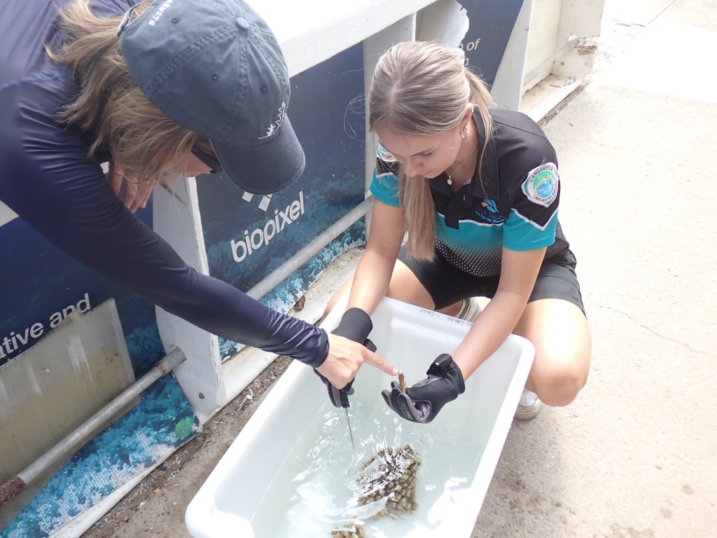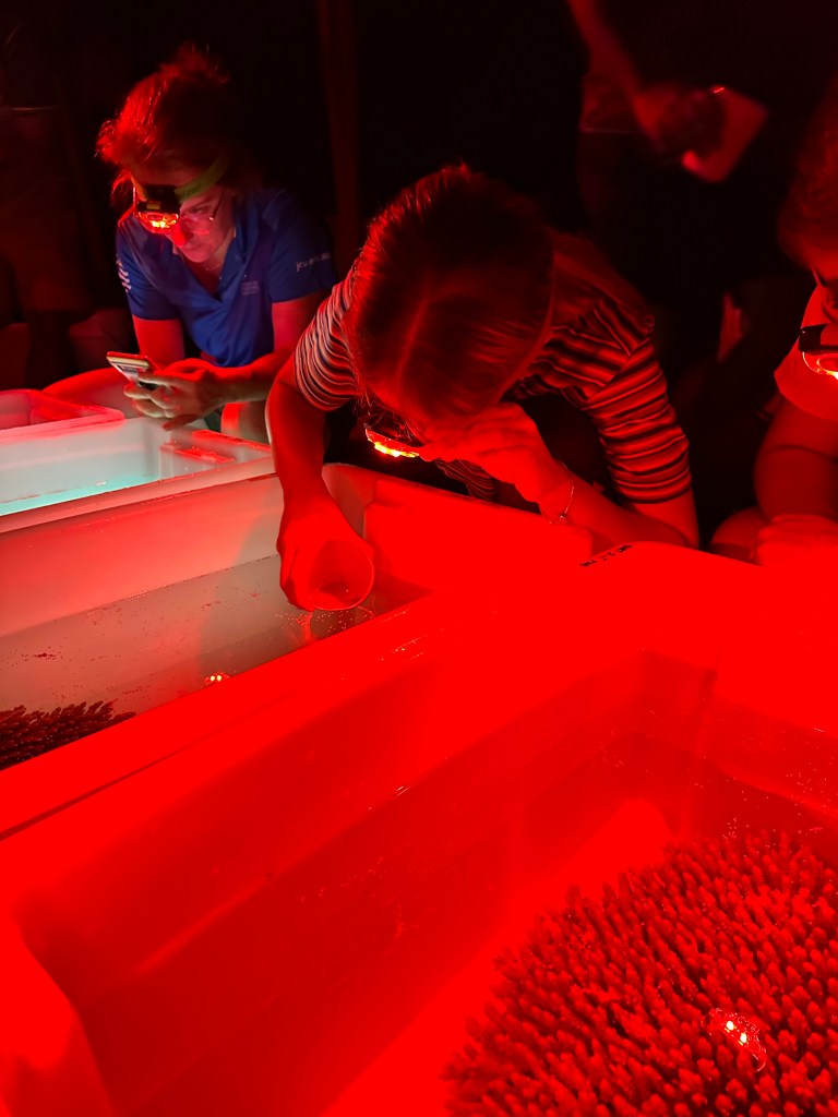 We also worked through some experiments to investigate how time of day might influence settlement behaviour in coral larvae, and concluded with settling our remaining coral larvae onto devices used in reef restoration that have been developed by colleagues at the Australian Institute for Marine Science under the Australian Government’s Reef Restoration and Adaptation Program. This work provided great opportunities for the Spawning School group to gain practical experience in planning and carrying out scientific investigations, including experimental design, experimental set up and delivery, monitoring and data entry, as well as hands-on familiarity with handling and manipulating fragile coral larvae.