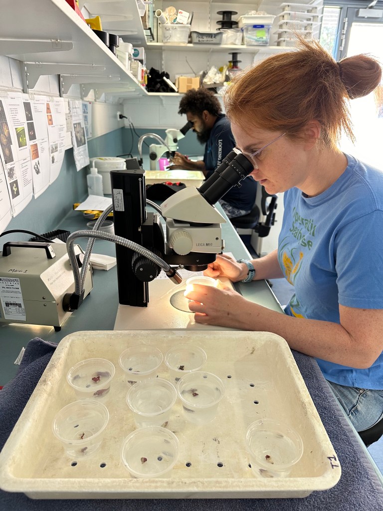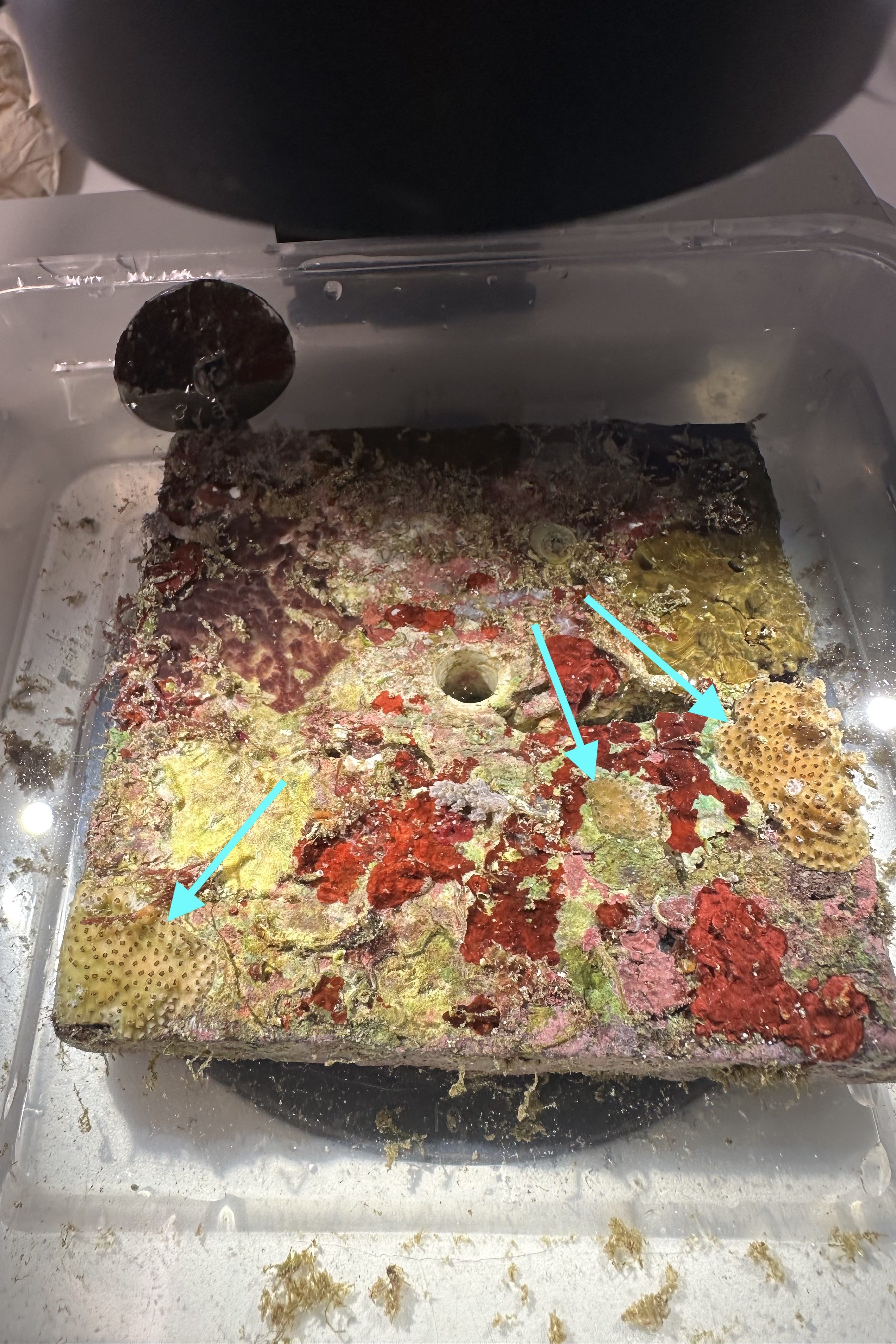 In between work with our new larvae, we counted and measured one year old juvenile corals from settlement tiles used in our 2022 Reef Cooperative project on Hastings Reef. This was a great opportunity for the Spawning School group to observe and monitor how corals grow and develop in their first year of life on the reef.